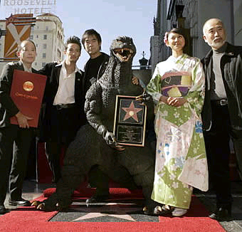 When I sift through assorted pool photographs from Japan in Yahoo Photos and the Mainichi Shimbun, I rarely need to spend much time searching for an appropriately inspiring — yet charmingly and disarmingly silly — slice of Japanese life. The image above, for example, was a winner in less than three seconds. Godzilla, fresh from a premiere of his new film Godzilla Final Wars, staking his claim to Hollywood immortality? Perfect — just don't make me see the movie.