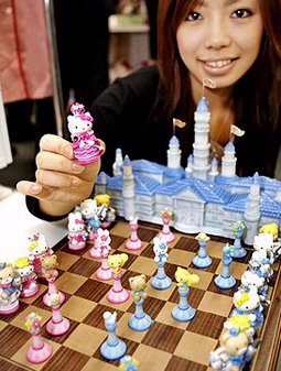 Hello Kitty, the moon-faced, mouthless white cat which comes on dolls, credit cards, laptops and vacuum cleaners as a global icon of cuteness has now advanced into the world of chess. Unlike the staid traditional black and white, the two camps facing off on the Hello Kitty chessboard are pastel pink and blue...."We started with mail-order as we do not know how much demand we will see," a Sanrio official said.