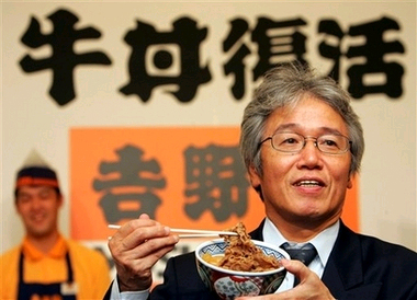 After a two-year moratorium on account of mad cow disease, dining colossus Yoshinoya D&C Company celebrated the resumption of American beef imports with a Tokyo press conference, its beef-and-rice dish the centerpiece. Company President Shuji Abe was probably well aware of humor associated with his industry when he plucked the contents of a meal from a ceramic bowl but, looking to sales predictions showing not the slightest loss of interest from the product's suspension, had reason to smile himself.