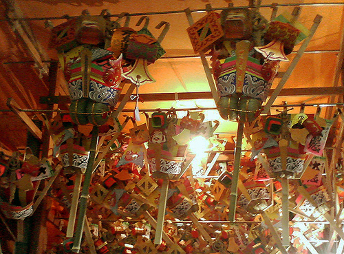 Green — economic if not chromatic — is what adorns the celebration, Yebisu being the resident god of commerce. "Trying to earn a little financial luck in the year to come," I am told, "everyone goes out and buys little ceremonial rakes." Why? "Because apparently you can't 'rake it in' if you don't have one." Craftsmen and merchants, one surmises, are among the devout.