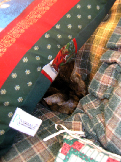 Most of my Christmas morning at the tree was spent having a ball with my folks as we opened presents and enjoyed a succession of coffee, cinammon rolls, orange juice and chocolates. Naturally, catblogging took place.